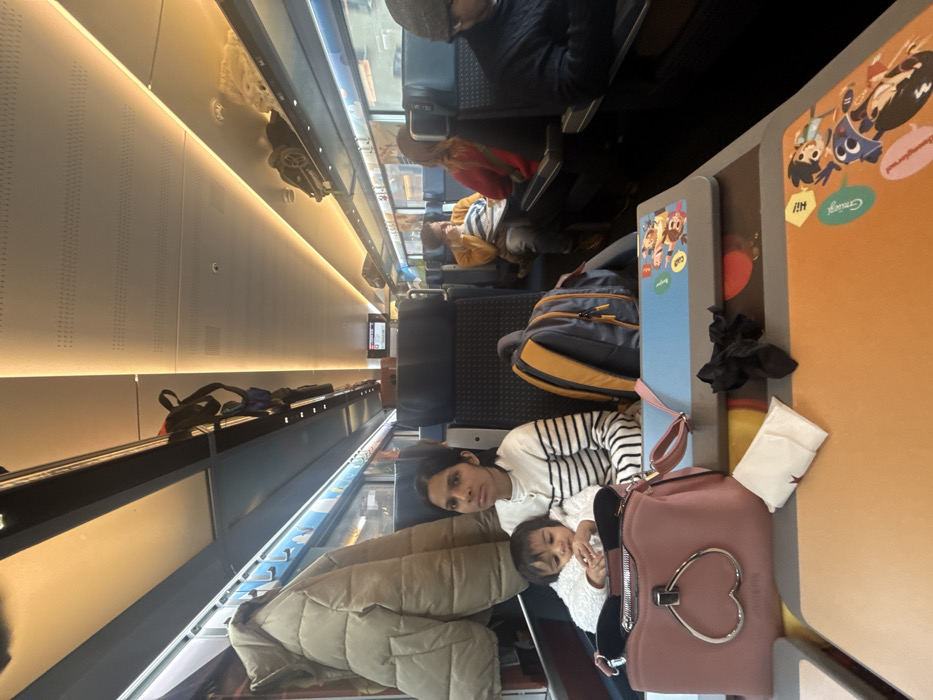 This image captures the interior of a modern passenger train car, presumably operating in or near Como, Italy, given the request context and train type common to the region (e.g., TILO). The scene is viewed from a lower deck, looking down a well-lit aisle towards the front or rear of the train. Overhead luggage racks contain various items, including a black backpack, a small blue bag, and a folded stroller. A tan puffer jacket hangs from a hook on the left. The train features large windows with decorative decals depicting mountains and houses, revealing an urban exterior with buildings. In the foreground, a woman with dark hair, wearing a white and black striped sweater, is seated on the left, holding an infant dressed in a white fluffy garment on her lap. Her gaze is directed forward. Next to her on the seat is a grey and yellow backpack. A pink handbag with a large silver ring-shaped handle, a small white packet, and a pair of black fabric items rest on the foldable tray table in front of them. The tray table itself features colorful cartoon decals with "Ciao!", "Grüezi", and "Hello!" speech bubbles. Further down the aisle on the right, additional passengers are visible. One person in a yellow sweater sits at a table, looking left, while another individual with reddish-brown hair in a red top sits opposite them. Closest to the foreground on the right, a person wearing a dark knit cap is seated, facing away from the camera, appearing to interact with a device on their lap. The interior is generally clean, with dark blue upholstered seats and bright, strip lighting along the ceiling.