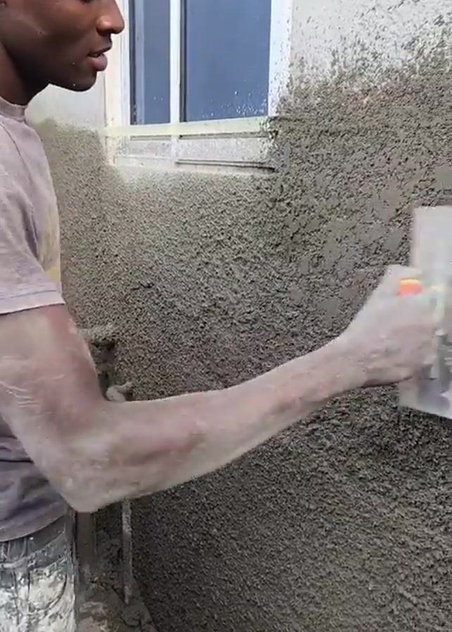 A man is shown applying stucco to an exterior wall