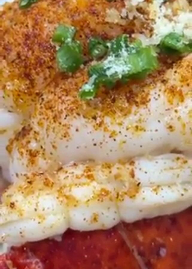 loaded baked potato topped with lobster meat, spices, and green onions, placed on a red tray