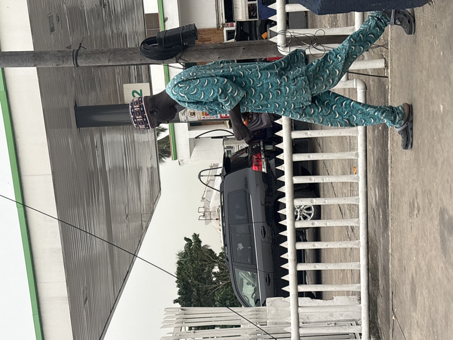 A man wearing a traditional patterned blue suit and a white and blue patterned cap walks in front of a gas station. He wears black Crocs on his feet. In the background, a black SUV sits behind a white metal fence. The gas station has a green and white overhang, and utility poles with attached black boxes are visible nearby.