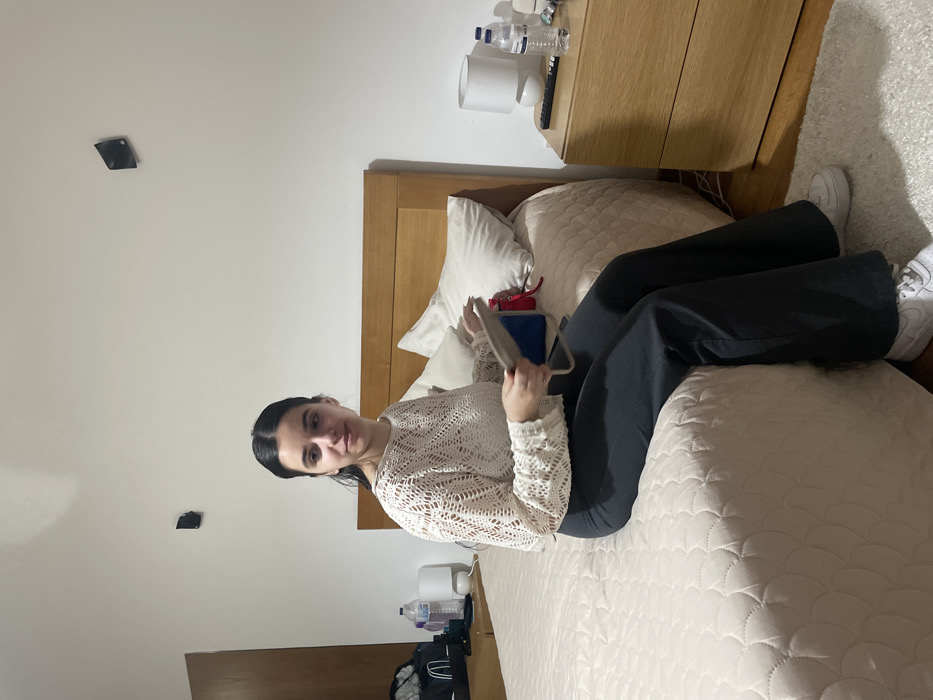 A young adult female is depicted sitting on the edge of a bed in a bedroom. She is positioned facing slightly to her left, wearing a cream-colored, long-sleeved, open-knit top, dark wide-leg trousers, and white sneakers. Her hair is dark and pulled back. In her right hand, she holds a light-colored, rectangular object with a strap. The bed features a light wooden headboard and a cream-colored quilted bedspread. Two white pillows rest against the headboard. To the left of the bed, a dark wooden bedside table is partially visible, topped with a white lamp and various items, including a clear bottle. To the right of the bed, a light wooden bedside table holds a white cylindrical lamp, a clear plastic bottle of water, and a dark remote control. The walls are white and plain, with two small, dark, rectangular devices mounted on the wall above the bed at different heights. The flooring beneath the right bedside table is covered by a light-colored, textured rug. The specific city location in Mirandela, Portugal, is not discernible from the image content.