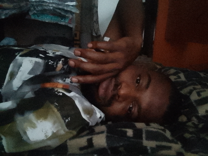 An adult individual with dark skin and dark hair is depicted lying on their back on a dark-patterned surface, likely a bed, in an indoor setting within the city of Unknown, Unknown