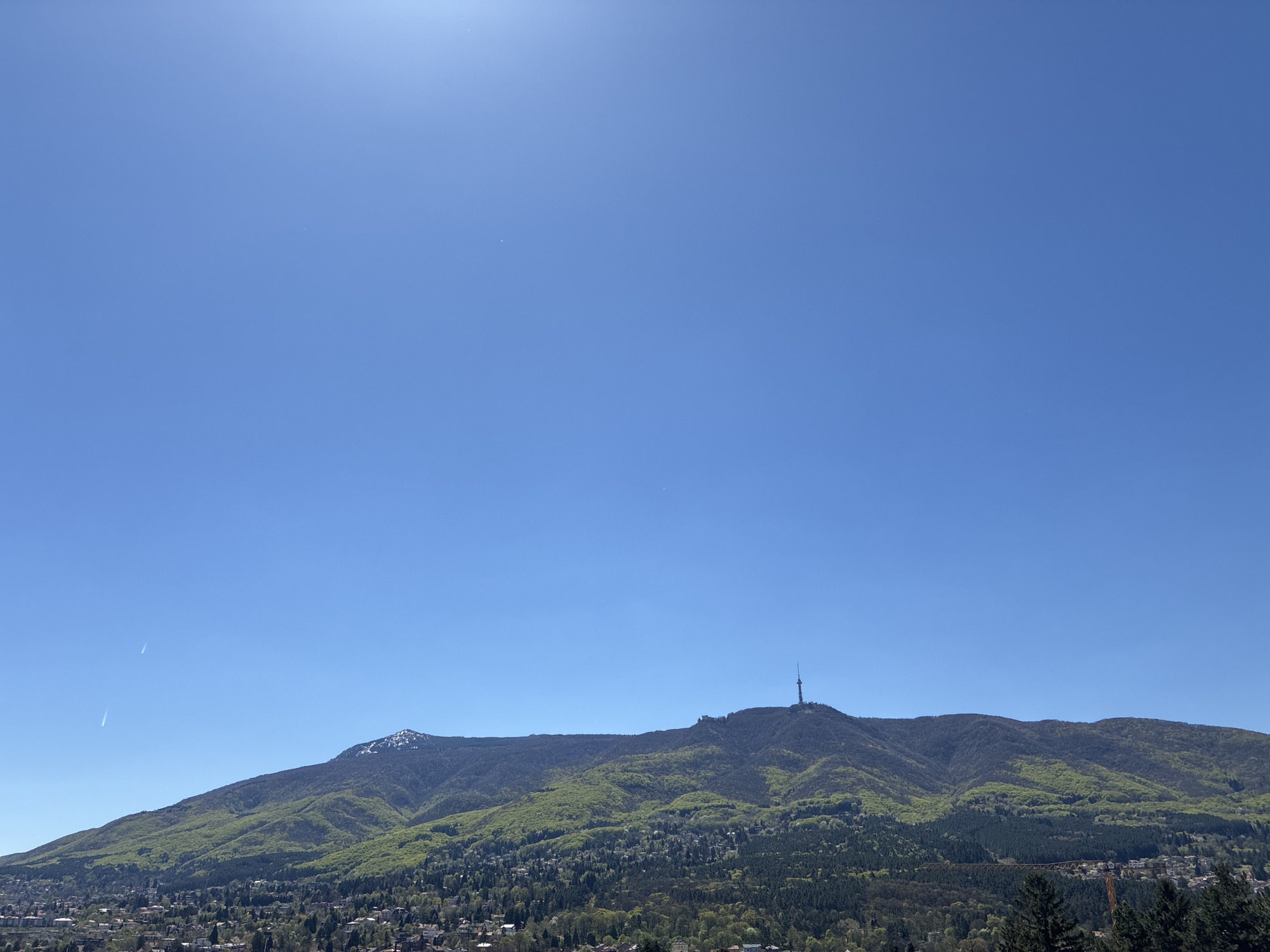 broad view of Vitosha Mountain, near Sofia, Bulgaria, under a clear blue sky. The mountain, mostly covered in green trees and vegetation, has a distinct peak with a telecommunications tower on the summit. Patches of snow are visible near the highest point on the left. The lower slopes of the mountain transition into a dense forested area, which extends towards the foreground. At the base of the mountain lies a city, densely packed with buildings and trees, indicating a residential or suburban area. A contrail from an aircraft is faintly visible in the sky to the left of the mountain.
