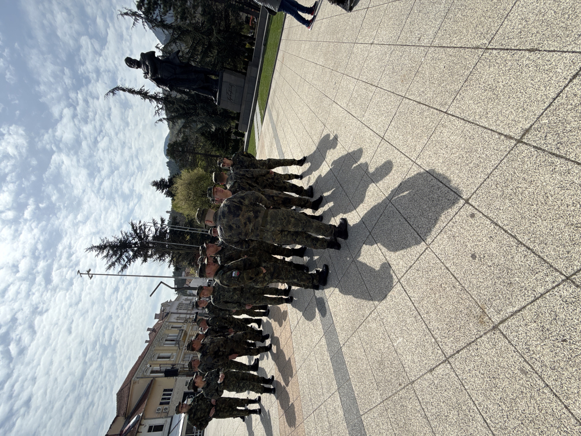 A medium-angle outdoor shot shows a formation of military personnel in Vratsa, Bulgaria, standing in formation on a paved area. The soldiers, wearing camouflage uniforms and caps, are arranged in multiple rows. Their shadows are cast across the ground. In the background, there is a statue, trees, and buildings. The sky is partly cloudy. The scene appears to be a formal event or ceremony. The ground is paved with square tiles.