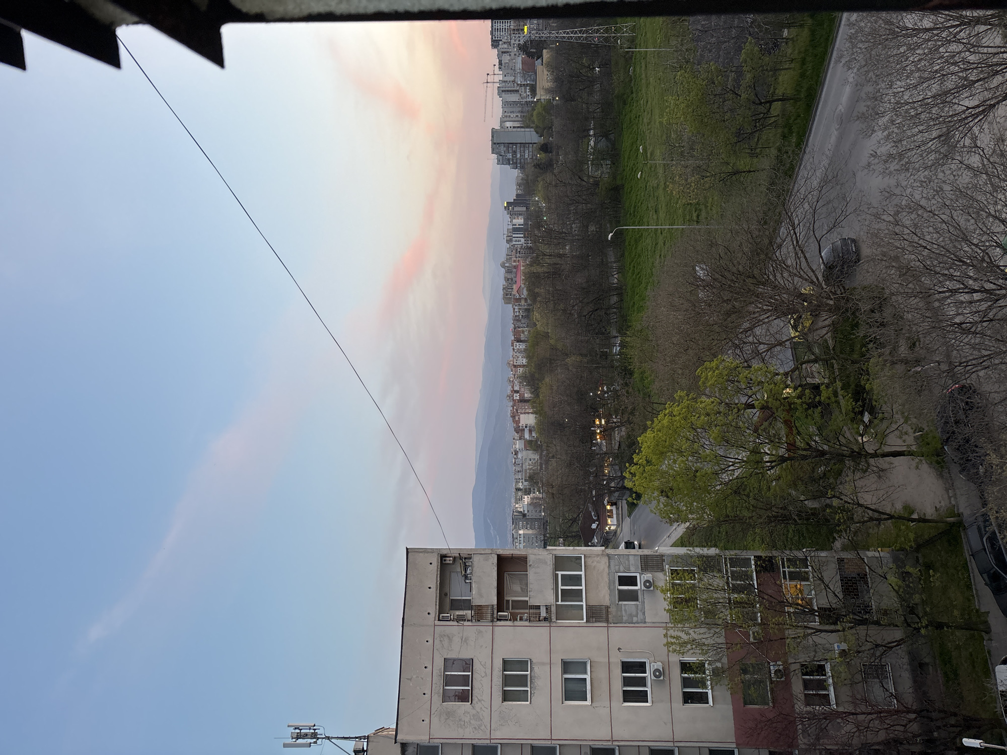 An exterior shot shows an urban landscape in Plovdiv, Bulgaria, possibly from an elevated position. A multi-story residential building, likely a Soviet-era construction, is situated in the foreground. Its facade is worn with various windows and attached air conditioning units. A utility wire spans across the sky. Beyond the building, a road is visible, bordered by trees and green spaces. In the background, there is an urban expanse with buildings of varying heights, fading into the distance and appearing to be close to a mountain range. The sky is a mixture of blues and pink hues, suggesting either dawn or dusk. There are no discernible people visible. A black vehicle is parked along the street.