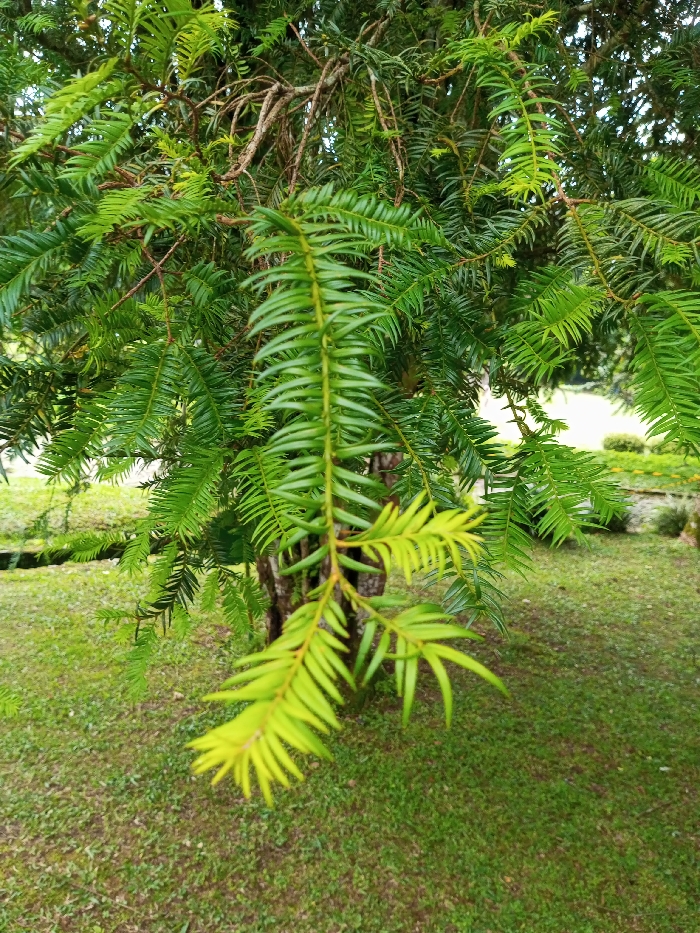 The image displays a close-up view of a coniferous tree located in Cimacan, Indonesia. The foreground is filled with dense foliage consisting of numerous needle-like leaves, predominantly in varying shades of green. A prominent branch, distinguished by its lighter, yellowish-green leaves, extends diagonally from the upper-right to the lower-left, slightly out of focus. Behind this, darker green foliage covers other branches. The tree's lower trunk or thick main branches, featuring visible reddish-brown bark, are located in the mid-ground, slightly to the left of the center. The background reveals a landscaped outdoor area. A grassy lawn covers the ground, showing some patches of sparser vegetation. To the left, a dark, linear channel or ditch is partially visible within the grass. To the right, blurred green shrubbery and a low, light-colored stone or concrete border are discernable. No individuals, actions, or specific interactions are present in the scene.