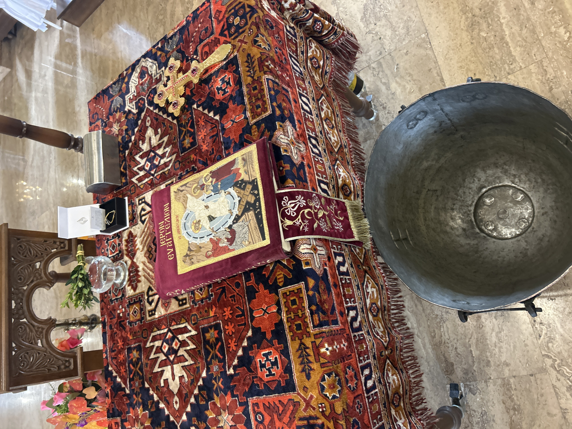 The image depicts a table covered with an ornate rug in what appears to be a church setting, likely in Tsalapitsa, Bulgaria. The rug features intricate patterns in red, navy, and gold. On the table, from left to right, are: a portion of a carved wooden structure, a small vase with flowers, two small boxes with gold jewelry, a metal container, a gilded cross, a book with a religious illustration and text in Greek, and a fringed cloth. A large, silver-colored bowl is positioned to the right of the table. The floor is made of beige tiles.