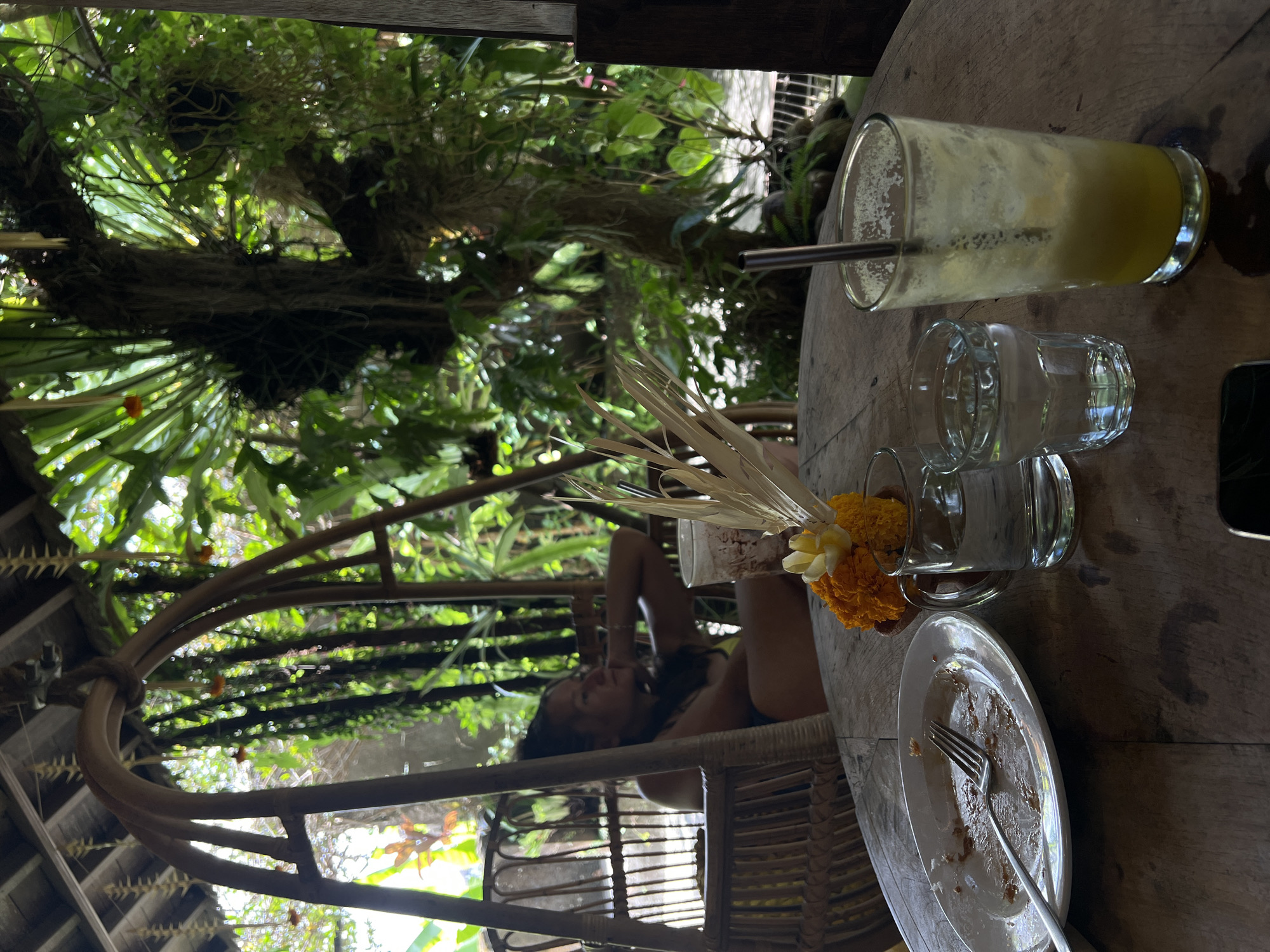 The image depicts a scene in the Ubud District, Indonesia, featuring a woman seated in a woven chair outdoors. The camera is positioned at a slightly elevated angle looking down at the table, with an abundance of lush greenery creating a canopy overhead. On the wooden table, there is a tall glass with a straw containing the remains of a light-colored drink, a few empty glasses, a small offering of yellow and white flowers, and a used plate with a fork. The woman is partially visible in the chair, seemingly relaxed and looking to the side. The setting suggests a tropical environment with natural materials and a relaxed atmosphere.