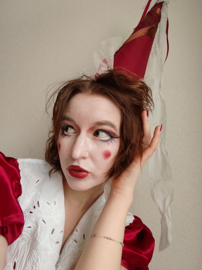 A female individual is depicted in a close-up, chest-up indoor portrait. She has shoulder-length, dark brown hair and a pale complexion, accented by elaborate makeup. Her face features red lipstick, circular red blush on both cheeks, and distinct eye makeup comprising dark red eyeshadow, dark blue winged eyeliner, white waterline liner, and dark lines extending downwards from the lower lash line. A conical headpiece, primarily dark red with lighter red or copper accents and trailing white sheer fabric, is worn on her head. She is dressed in a white garment with a large, pointed, embroidered collar featuring eyelet cutouts, revealing red puffed sleeves beneath. A delicate silver-colored chain bracelet is worn on her left wrist, and a ring is visible on her left ring finger. Her left hand is raised, with fingers touching the hair near her ear. Her eyes are directed upwards and to the right, and her mouth is slightly open. The background is a plain, light-colored wall with a subtle texture. No specific location within the city of Riga, Latvia, can be determined from the visual information provided in the image.