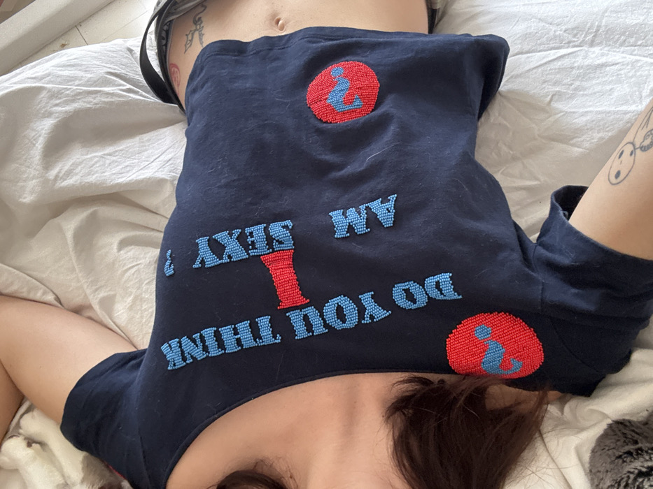 single individual lying supine on white, wrinkled bedding in an indoor setting in Barcelona, Spain. The subject's head is cropped, with dark hair visible on the left side. The individual wears a dark blue, short-sleeved t-shirt featuring the phrase "DO YOU THINK I AM SEXY" in light blue beads, with the "I" replaced by a red beaded phallic symbol. Two circular red beaded patches are present on the shirt: one on the left with a light blue beaded question mark, and another on the right with a light blue beaded silhouette of a person. The subject's lower abdomen and navel are exposed. Visible tattoos include a black outline drawing on the inner left forearm, a small black outline tattoo on the outer right forearm, and a red design on the right hip area. A dark strap, consistent with an undergarment, is visible near the right hip. The lighting is ambient.