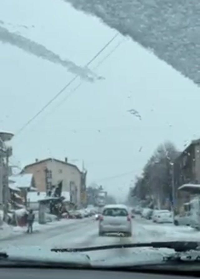 A car drives on a snowy road in a town