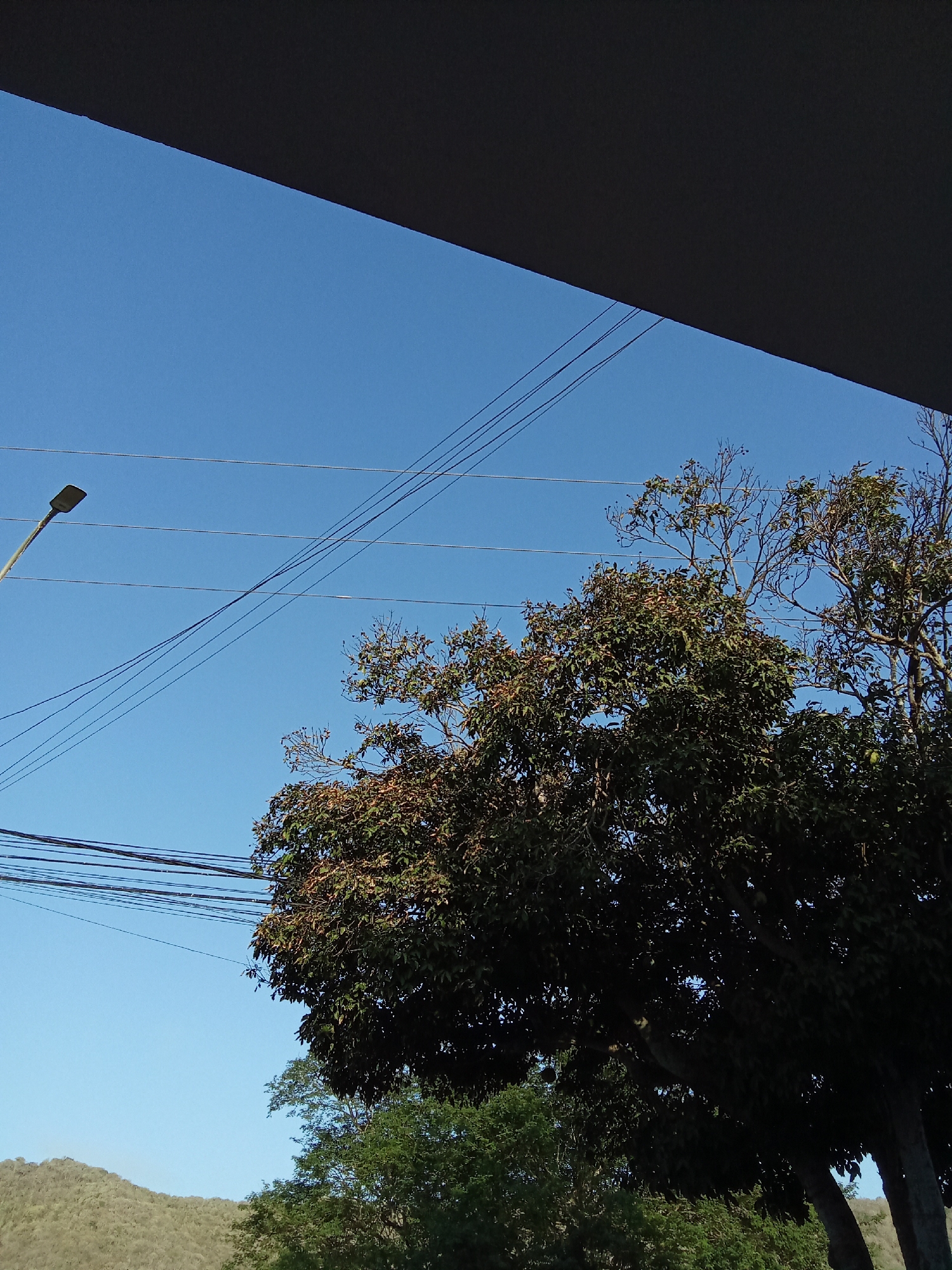 daytime view in La Asuncion, Venezuela, captured from a partially obscured vantage point, potentially under a building overhang. The sky is clear and blue. A utility pole with a single street light is visible on the left side of the frame, alongside several power lines running across the sky. A large tree with dense foliage occupies the right side of the image, partially obscuring a lower, smaller tree in the background. Beyond the trees, a gently sloped hillside is visible.