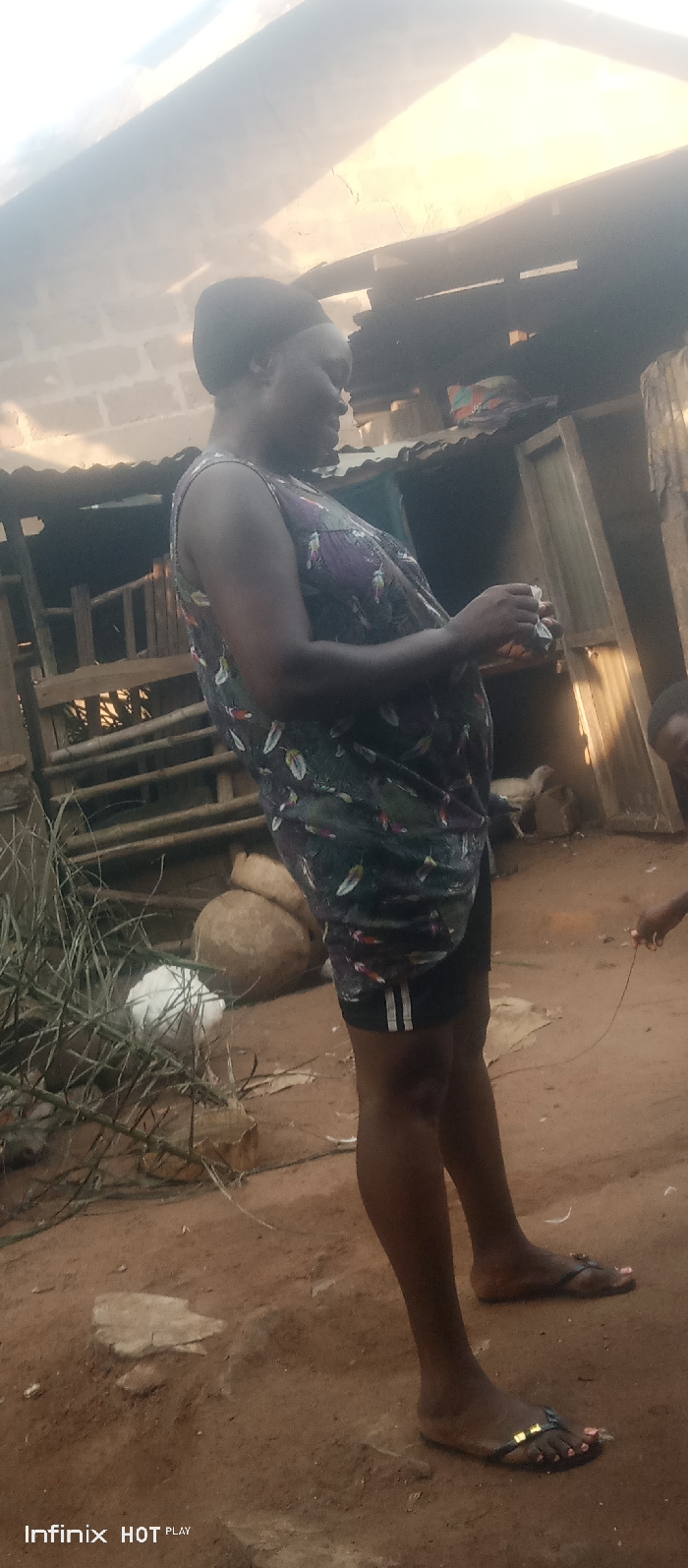 A woman with her hair tied back stands outdoors in casual attire: a patterned sleeveless top and dark shorts with two white stripes. She wears sandals. The setting is a yard with dirt ground. A small child is visible on the right. In the background, there's a rustic wooden structure, foliage, and a chicken. The image bears the "Infinix HOT Play" watermark.