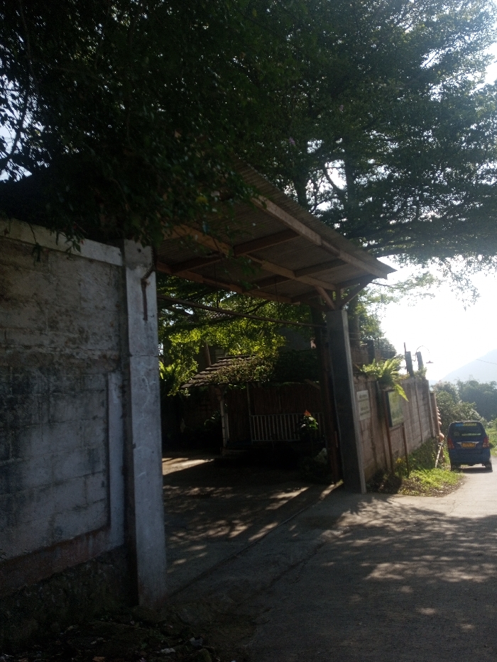 The image displays an outdoor scene in Niz Lakuk, India, featuring an entrance to a property from a paved road under bright sunlight. A weathered concrete wall and pillar define the left side of the gateway, while a wooden post forms the right. A corrugated metal roof, supported by wooden beams, spans overhead as a canopy. Beyond this entrance, a shaded interior reveals a small building with a dark, possibly thatched roof and lighter-colored vertical siding, set amidst dense green foliage. To the right of the gateway, a wooden fence or wall runs along the roadside, adorned with plants and an exterior light fixture. The asphalt road, marked by dappled shadows from overhead trees, extends into the background where a dark blue minivan is parked facing away from the viewer on the right shoulder. Large trees with dense green canopies dominate the upper portion of the frame, and distant hills are visible against a bright sky. No people or specific interactions are visible within the scene.