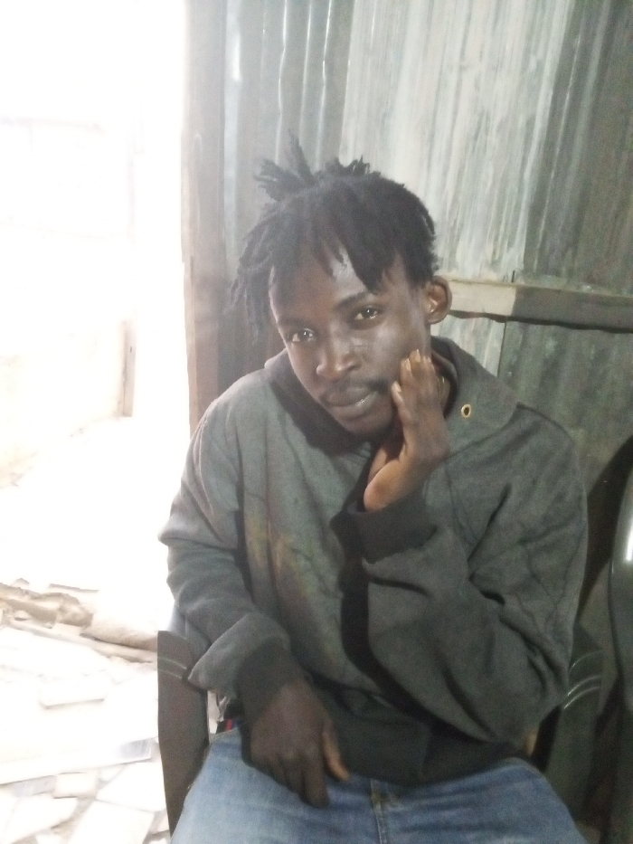 A young man with dreadlocks is sitting in a chair, wearing a gray hooded sweatshirt and blue jeans. He is looking at the camera with a slight smile and his hand is on his face. The background consists of corrugated metal sheets, possibly a wall. The lighting is somewhat dim. The floor area appears to be littered with what might be debris or tiles.
