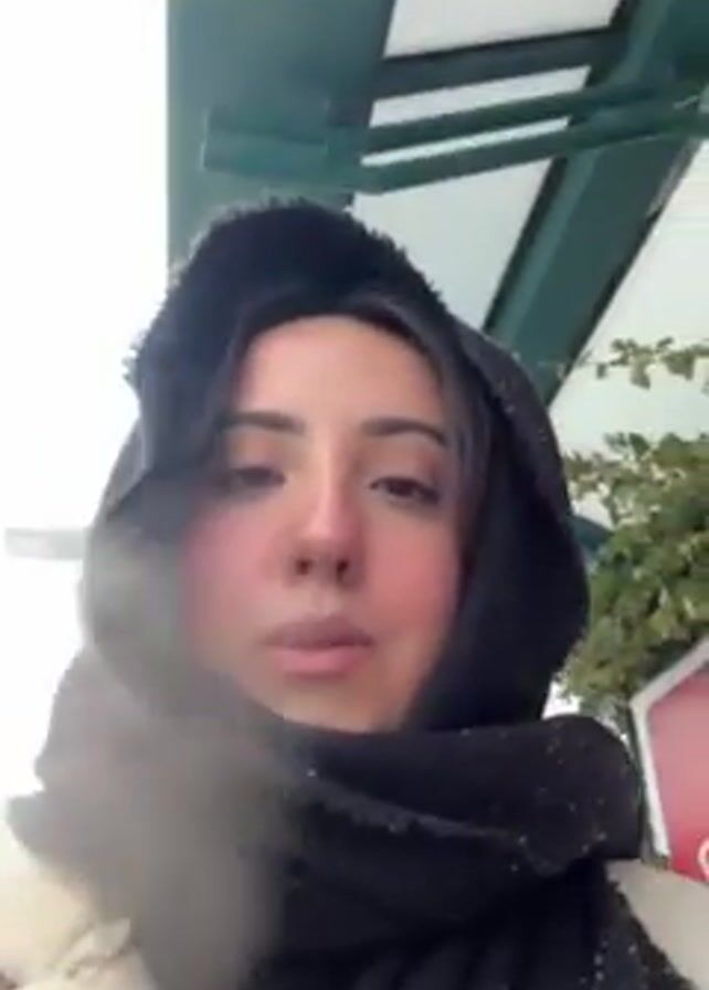 A woman wearing a black hooded scarf and a cream-colored jacket is holding and using a vape pen