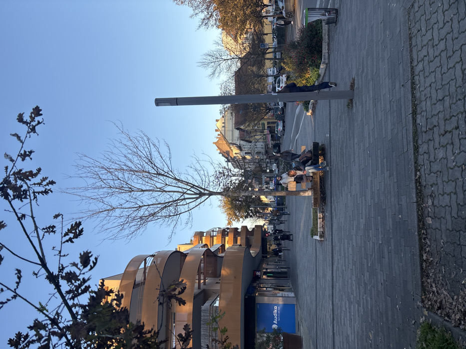 The image depicts a street scene in Schiltigheim, France, captured under clear blue skies with direct late afternoon sunlight. The foreground features a grey interlocking paver sidewalk with scattered dry leaves. On the left, a multi-story building with distinctive curved, orange/brown balconies extends along the street. Its ground floor houses commercial establishments, including "Audika" with a prominent blue sign. Further down the sidewalk, several indistinct pedestrians are walking, one pushing a stroller. In the mid-ground, a bare deciduous tree with thin branches stands next to a modern public bench with wooden slats and a dark frame, integrated into a raised planter. Two individuals are seated on this bench. The person on the left wears a dark jacket, blue jeans, and light shoes, looking down at a small object. The second person, to their right, is partially obscured, dressed in a dark jacket. Behind the bench, a third individual stands, wearing a light-colored top. To the right of the bench, a tall, grey lamppost is positioned. A person in a dark jacket and blue jeans, with light shoes, is walking from right to left, partially obscured by the lamppost. Adjacent to the lamppost is a green and silver public waste bin and a bush. On the right side of the image, beyond the sidewalk, a street with parked cars and visible vehicle traffic extends into the distance. Beyond the street, multi-story residential or commercial buildings with traditional European architectural styles, varied rooflines, and windows line the roadway. Trees with some remaining autumn foliage are visible along the street and behind the buildings. The sunlight illuminates the upper portions of the buildings on the left and the trees and buildings on the right, creating long shadows across the pavement.