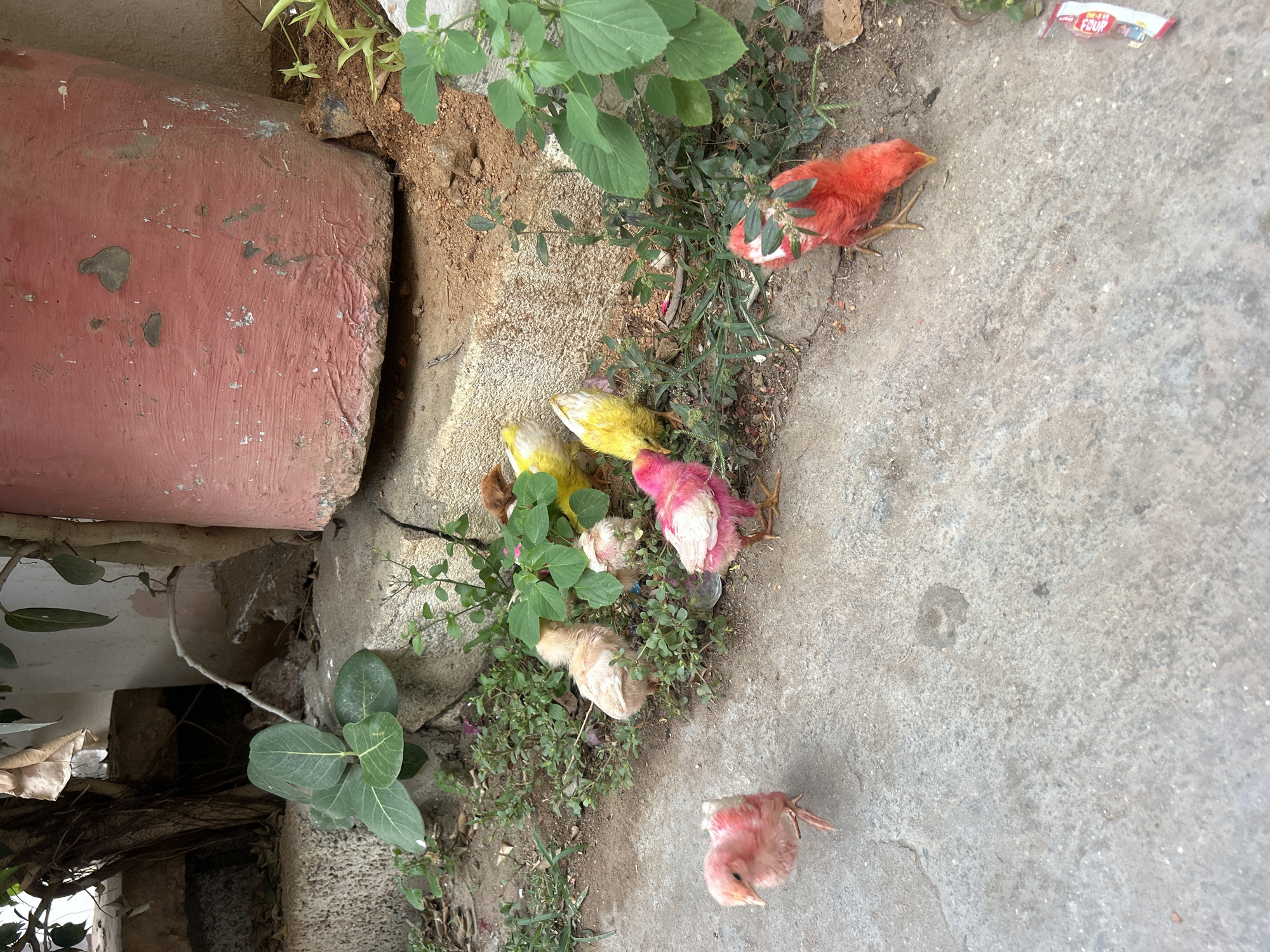 - "The image displays an outdoor ground-level scene in Puttaparthi, India, populated by eight artificially colored chicks" by FM-YIfw03, licensed under CC BY 4.0
