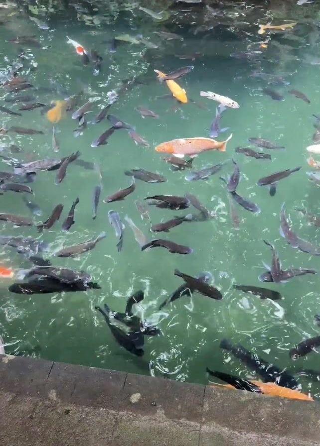A high-angle, medium shot shows a pool of water densely populated with numerous fish, predominantly black and orange koi. The water is a slightly murky green color, with ripples disturbing the surface. The fish are of varying sizes and move actively within the pool. The edges of the pool are lined with dark gray stone tiles. A verdant wall of plants, including green shrubs and some flowering plants with pink blossoms, borders the pool on one side. A few faint human voices are audible in the background.