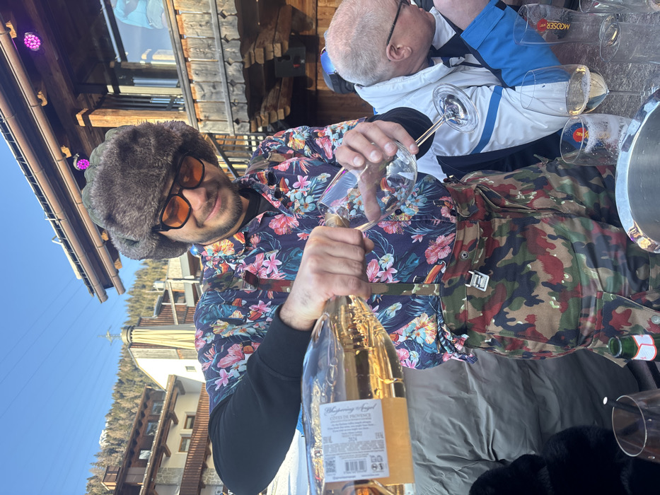 An adult male is captured in an outdoor daytime setting, pouring liquid from a large clear bottle into a wine glass at a table in Sankt Anton am Arlberg, Austria