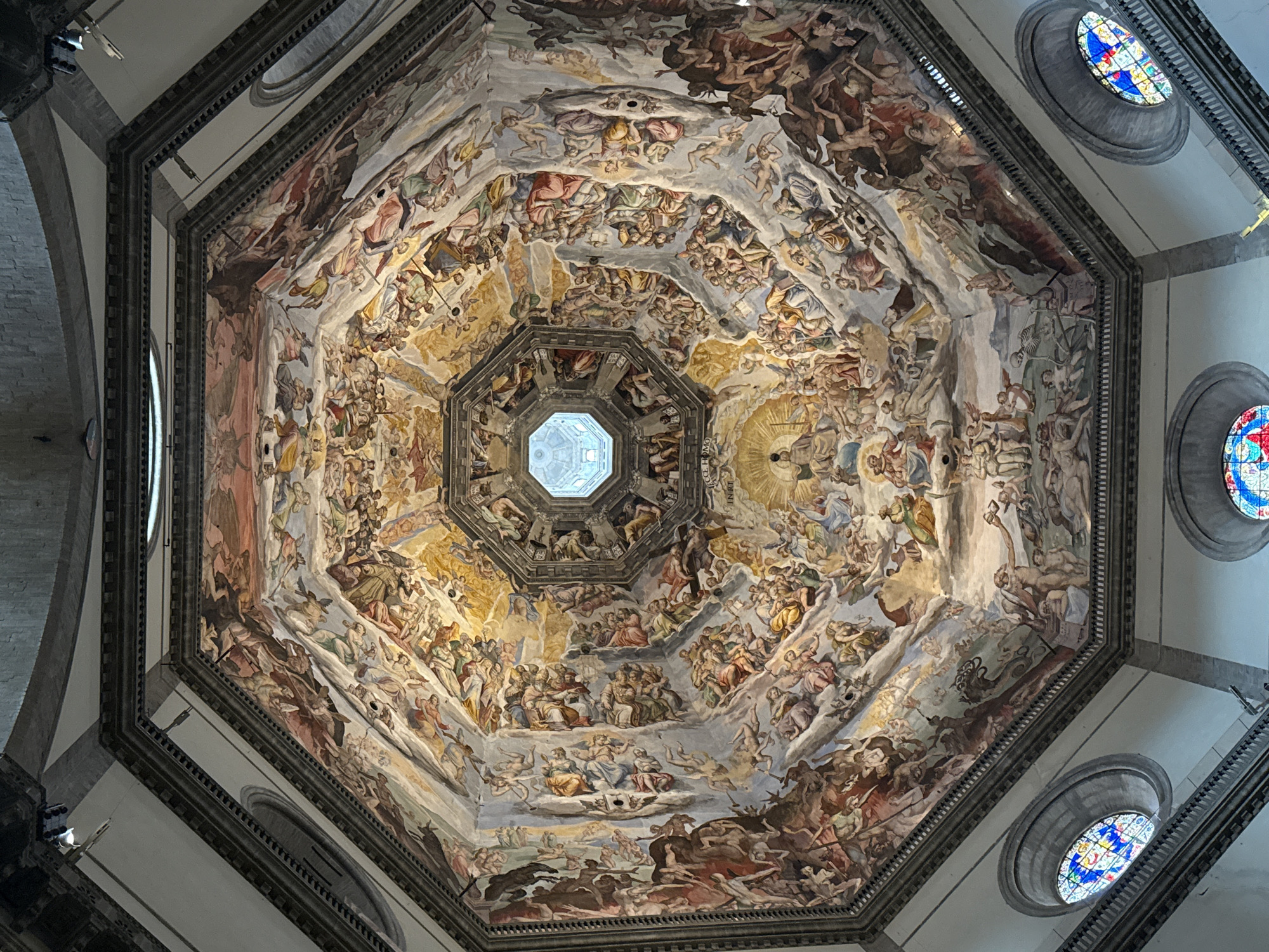 The image presents an upward view into the vast, octagonal frescoed dome of the Florence Cathedral (Duomo di Firenze) in Florence, Italy. The entire inner surface of the dome is covered with a detailed mural depicting "The Last Judgment," rendered in Renaissance style with a rich palette of blues, reds, golds, and browns. At the dome's apex, a small, circular oculus provides natural light. The fresco composition unfolds in concentric tiers radiating from this center. The uppermost sections depict celestial realms with numerous robed and semi-nude figures of angels and saints on clouds, surrounded by golden auras. Below these, the middle tiers show groups of figures, some ascending or gathered, representing the blessed. A prominent central figure, likely Christ in Majesty, is seated with a radiant golden halo, flanked by other major religious figures. Below this, partially visible is the inscription "ECCE HOMO." The lower tiers of the fresco dramatically illustrate scenes of damnation and hell. These areas feature densely packed, mostly nude figures suffering torment, interacting with winged demons, monstrous creatures, and skeletal representations of death. Actions depicted include figures being judged, pulled, or falling into suffering. The octagonal structure of the dome is framed by dark architectural ribs and a decorative cornice. At the base of the dome, two circular stained-glass windows with intricate blue, red, and yellow patterns are visible on the light-colored surrounding walls, admitting additional light into the space. Small, dark artificial lighting fixtures are mounted on the architectural elements below the dome's cornice.