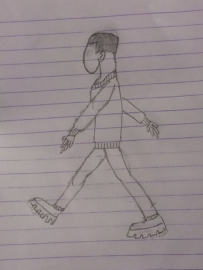 The image displays a monochrome pencil drawing of a human figure in a walking pose, rendered in profile facing left. The drawing is executed on white paper featuring horizontal blue ruled lines. The figure has a simplified head with an ear visible and short, shaded dark hair. No distinct facial features are discernible. The individual wears a long-sleeved top or sweater with ribbed cuffs at the wrists and hem, and pants. Both hands are shown with distinct fingers. The feet are depicted in shoes with thick, lugged soles. The pose suggests dynamic movement, with the left arm and right leg extended forward, and the right arm and left leg extended backward. The scene is an artistic representation on lined paper and does not depict a physical location within the city of Iranla, Nigeria, or any other real-world environment.