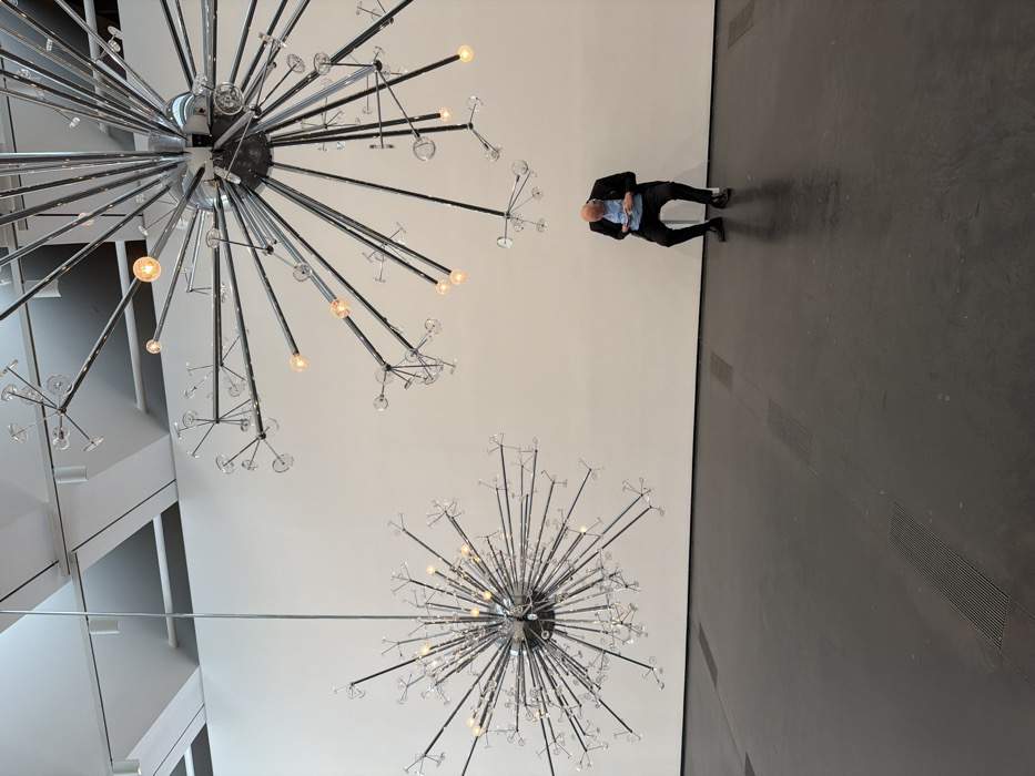 This image depicts an interior view of The Broad Museum, located at 221 S Grand Ave, Los Angeles, California, United States of America. The scene features a high-ceilinged, minimalist architectural space with stark white walls and a dark grey, likely concrete, floor. Two large, spherical, chrome-plated light sculptures are suspended from the white ceiling. These sculptures consist of numerous radiating arms; some terminate in small, clear glass or acrylic discs, while others hold illuminated incandescent bulbs emitting a warm, orange-yellow light. The sculpture in the upper right foreground is partially cropped, while a second, slightly smaller sculpture hangs in the mid-left. The ceiling shows visible structural beams and recessed lighting fixtures. In the lower right portion of the frame, an adult male is seated directly on the dark grey floor, leaning against the white wall. He is dressed in a dark suit jacket, a light blue collared shirt, dark trousers, and dark dress shoes. His head is bowed as he looks down, holding and interacting with a small, dark rectangular electronic device, presumably a smartphone, with both hands. The dark grey floor contains several linear, rectangular metal grates embedded into its surface.