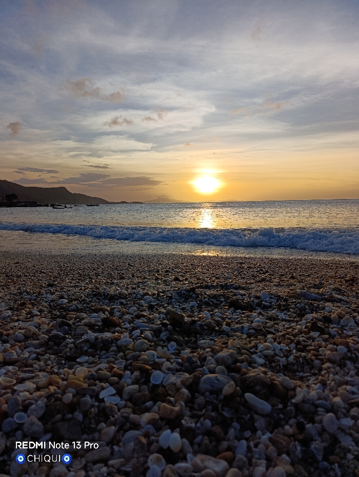 A coastal scene at either sunset or sunrise is depicted from a low vantage point on a pebble beach in Juan Griego, Venezuela. The foreground is composed of densely packed, small, irregular pebbles and shell fragments in varying shades of brown, grey, and white, with some lighter-colored shell pieces prominent. Gentle waves are breaking onto the shore in the midground, characterized by a thin line of white foam. The sun, a bright golden orb, is positioned low on the horizon directly over the water, casting a distinct path of shimmering light across the calm ocean surface toward the viewer. The sky above exhibits a gradient from light blue and grey with scattered, indistinct clouds at the top, transitioning to warm yellow and orange tones around the sun. In the distant left portion of the frame, dark silhouettes of low-lying hills or mountains are visible along the coastline, with the faint outlines of several small boats discernible offshore. No human figures or discernible human activity are present in the scene. A digital watermark displaying "REDMI Note 13 Pro" and "CHIQUI" is present in the lower-left corner.
