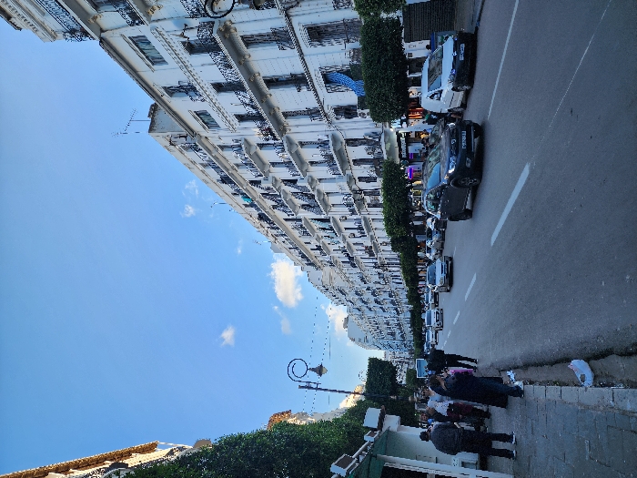 street scene in Alger Centre, Algeria, at the location with coordinates (latitude: 36.769, longitude: 3.055). The street is lined with tall, white buildings with balconies and decorative ironwork. There are trees planted along the curb, and a few people are walking on the sidewalk. The street is paved with asphalt, and there are a few cars parked along the side of the road. A dark gray car is driving down the street. The sky is blue and clear. There is a white van parked on the right side of the street. The white van is facing the same direction as the gray car. A group of people are standing on the sidewalk on the left side of the street. There is a streetlight pole with a light on top of it, and there are wires running along the top of the buildings. The buildings are all in good condition and look relatively modern.