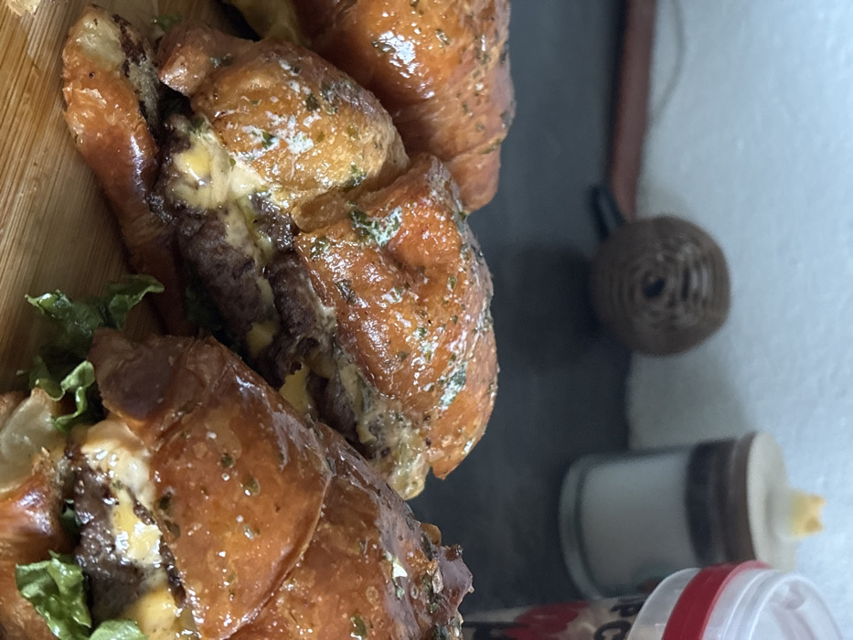 - "The image displays a close-up, elevated view of multiple assembled food items resembling croissant-burgers, resting on a light brown wooden surface" by FM-r52ok1, licensed under CC BY 4.0