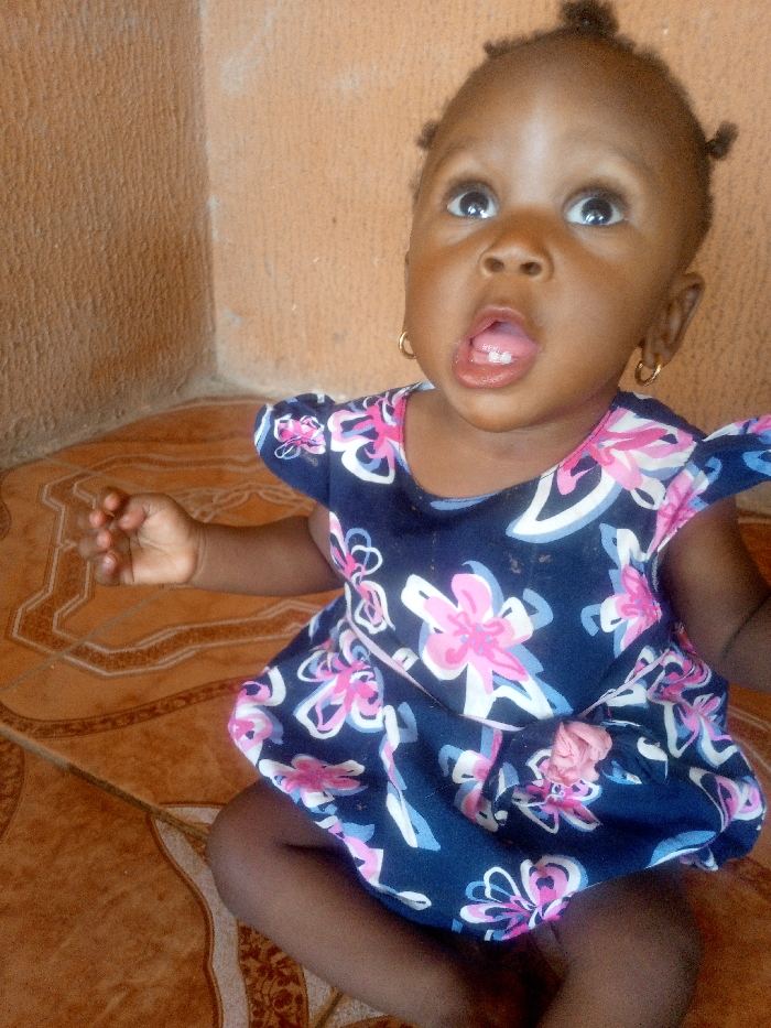A dark-skinned infant is depicted seated on a tiled floor in Zango-ndaji, Nigeria. The infant, wearing a navy blue dress with pink, white, and light blue floral patterns and small gold hoop earrings, faces slightly forward with her gaze directed upwards. Her mouth is open, revealing the tongue and two lower front teeth. Her hair is styled in small dark knots. The floor is composed of reddish-brown and lighter-toned geometric tiles. The background consists of a corner formed by two light orange, textured walls. The infant's left hand is open with fingers slightly curled; the right hand is largely out of view.