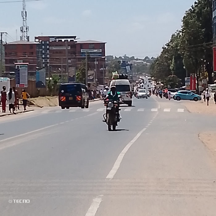 The image depicts a daytime street scene in Machakos Central ward, Kenya, looking down a multi-lane asphalt road that recedes into the distance