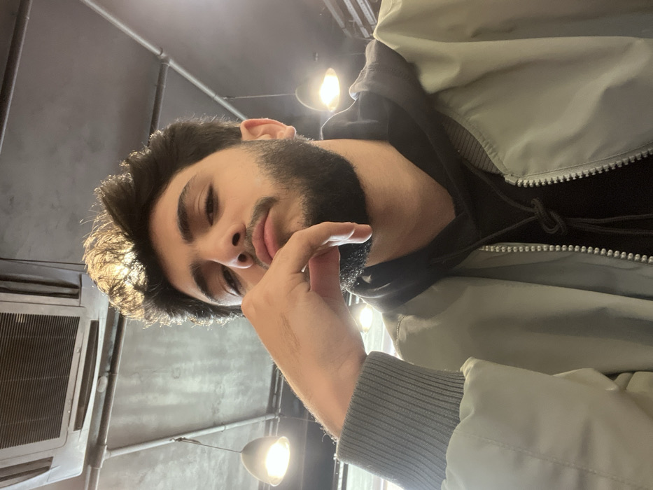 A young adult male, approximately 18-25 years old, with dark hair, a beard, and a mustache, is depicted from a low-angle perspective, looking directly at the camera