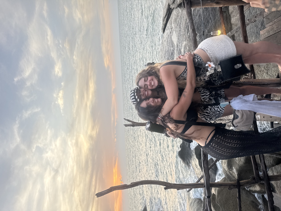 Four smiling women embrace by the ocean at sunset. They are dressed in fashionable attire, including a white crocheted skirt, a black and white print top, and a black crocheted outfit. A camera is visible in the foreground, near rocks, wooden poles, and light fixtures. The background features a cloudy sky over an ocean horizon.
