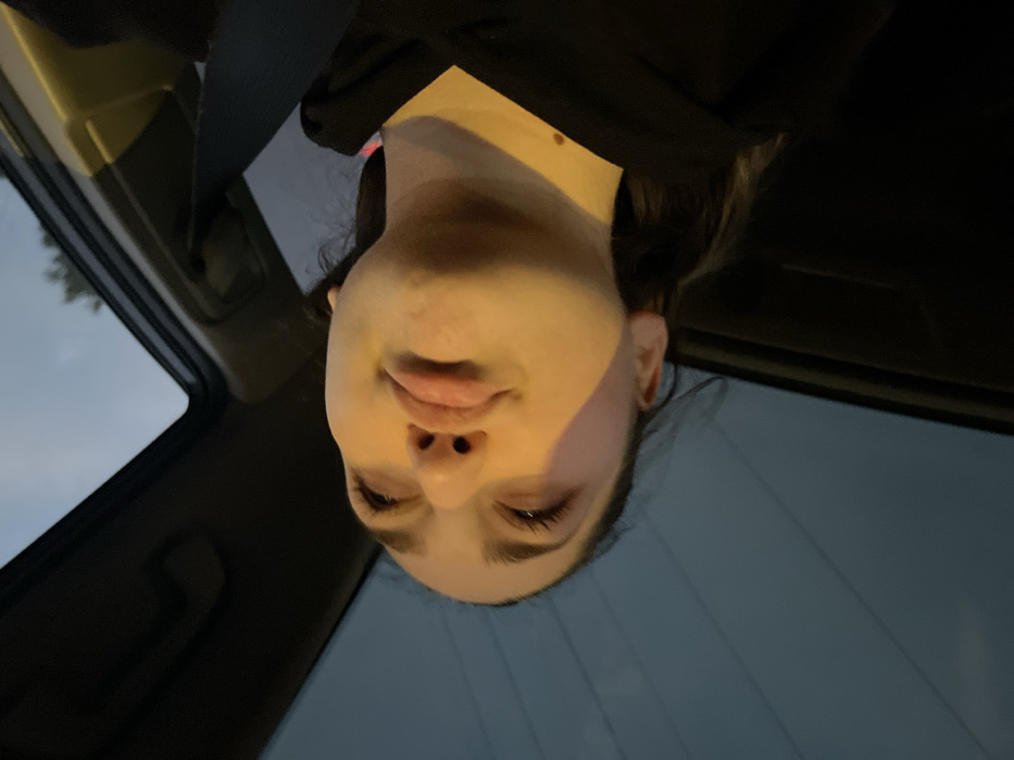 This image depicts one female individual inside a vehicle in Vendenheim, France. The subject is seen from a low angle, with her head tilted upwards and to the right. Her upper face is illuminated by a warm, yellowish light source from the left foreground, casting shadow on her right cheek and neck. Her eyes appear partially closed, lips are slightly parted, and a small stud is visible in her left nostril. She wears a dark-colored garment, and a black seatbelt diagonal to her right shoulder indicates she is an occupant of the vehicle. An open sunroof overhead displays a dark, cloudy sky. The vehicle's left side window shows a dark, indeterminate outdoor environment.