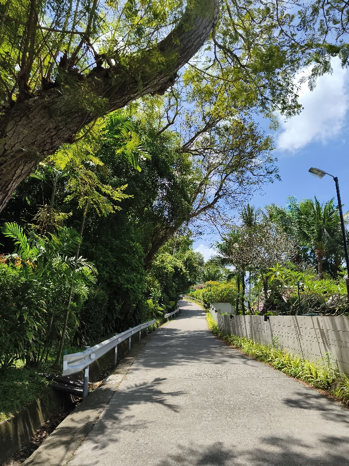 A winding road ascends, flanked by lush greenery. A massive tree branch stretches over the left side, providing shade. A white guardrail and dense foliage line the left edge of the road, while a white wall with vegetation borders the right. The sun casts shadows on the asphalt, and a tall streetlight stands on the right against a partly cloudy blue sky. The overall scene evokes a tropical, peaceful atmosphere.