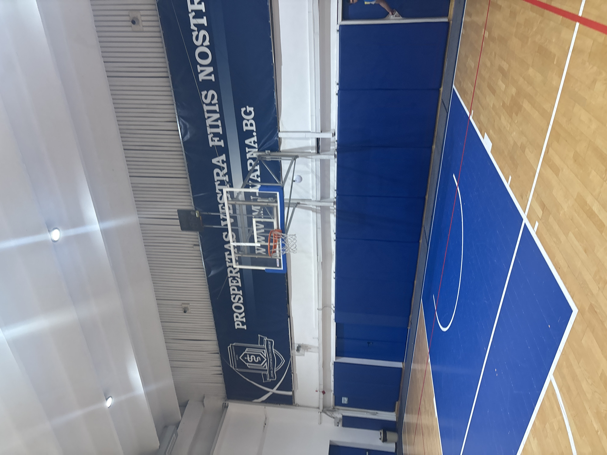 interior of a basketball court. The court has a blue key and a light-colored wooden floor. The basketball hoop is visible, with a blue and white backboard. A banner above the hoop reads "PROSPERITAS VESTRA FINIS NOSTER" and "WWW.VARNA.BG", indicating that this is likely a school or sports facility located in Varna, Bulgaria. The environment includes white walls and ceiling with lights. No people are clearly identifiable except for a small portion of leg/shoe in the upper right corner.