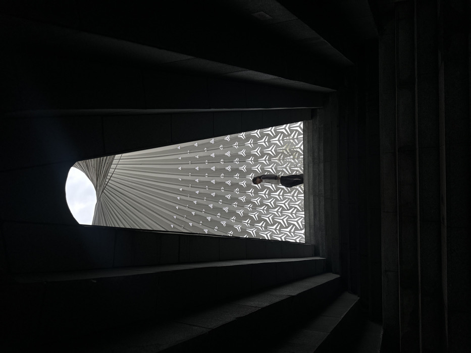 The image displays a dark, multi-tiered stone staircase ascending towards a brightly illuminated architectural opening within a structure located in Liangjiang, China. The foreground and the heavy structural walls flanking the opening are rendered in deep shadow. At the top of the stairs, a single adult figure stands on a landing, partially silhouetted against the bright background. This individual wears dark trousers and a lighter-colored upper garment, standing still and facing towards the left. The architectural opening itself features a white, perforated screen with a repeating geometric pattern of interlocking trefoil shapes, positioned beneath a curved, radially ribbed ceiling structure. A small, irregularly shaped section of overcast sky is visible through an aperture at the upper part of the opening. The scene is characterized by stark contrast between the dark, enclosed foreground and the intensely lit background elements.