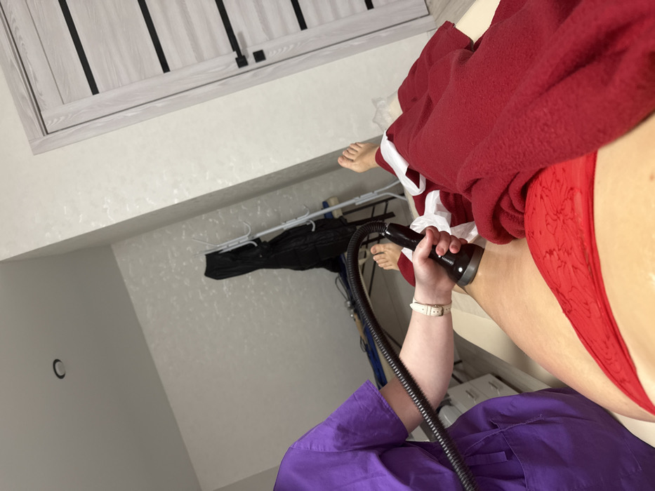 The scene depicts an indoor treatment room located in Chaikovsky, Russia. A practitioner, identifiable by their purple medical scrubs and light-colored wristband, is performing a procedure on a patient. The practitioner holds a black, handheld device with a circular head, connected via a black ribbed hose, and applies it to the inner thigh of the patient's right leg. The patient lies supine on a light-colored treatment table, wearing red lace underwear and partially covered by a red fleece-like blanket. Their bare feet are visible towards the top of the frame. The background features light-colored, textured walls, a light-colored door with multiple dark horizontal stripes and a dark handle, and a white coat rack holding a black jacket. A single circular recessed light fixture is visible on the white ceiling.