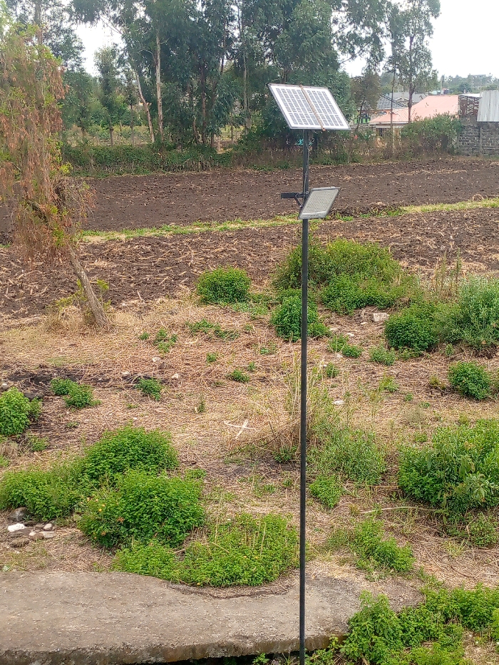 The image displays a solar-powered street light installation in a rural or semi-rural setting within the city of Unknown, Unknown