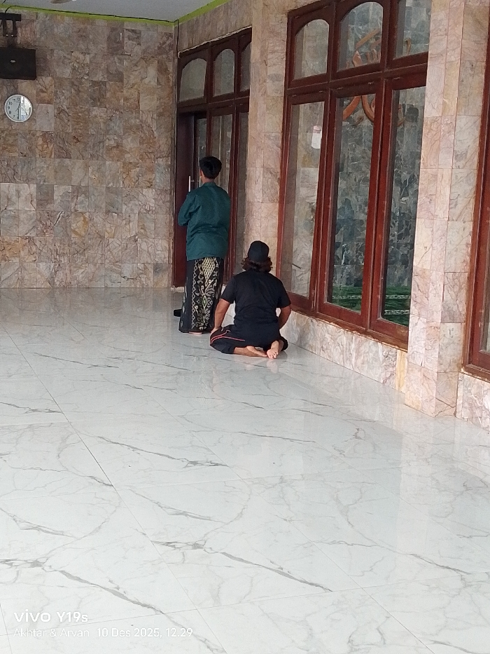 Two men are praying in a mosque. One stands wearing a green shirt and patterned sarong, facing towards the wall. The other kneels in a black shirt and pants, facing right towards large windows. The mosque's interior features a wall tiled with stone patterns and a white marble floor. A clock hangs on the wall above the standing man. The photo was taken on December 10, 2025, at 12:29.