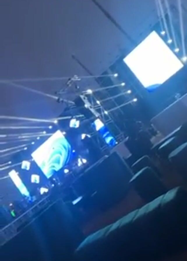 The video depicts a venue with a stage adorned with screens, lights, and rigging, accompanied by plush seating in the foreground