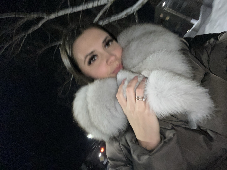 A female individual is depicted in a close-up, outdoor shot at night in Chaikovsky, Russia, during winter. She has dark hair and is looking directly towards the camera with a composed expression. She wears a dark-colored puffer coat with a prominent, light gray fur collar. Her right hand, adorned with a multi-band ring on the ring finger, is placed on the fur collar, gently holding it towards her face. The background is dark, indicating nighttime, with a few faint artificial lights visible in the distant left, suggestive of vehicle lights or streetlights. Bare tree branches are visible against the dark sky on the right side of the frame. Patches of snow are visible on the ground in the lower right. A dimly lit building is discernible in the far background on the right.