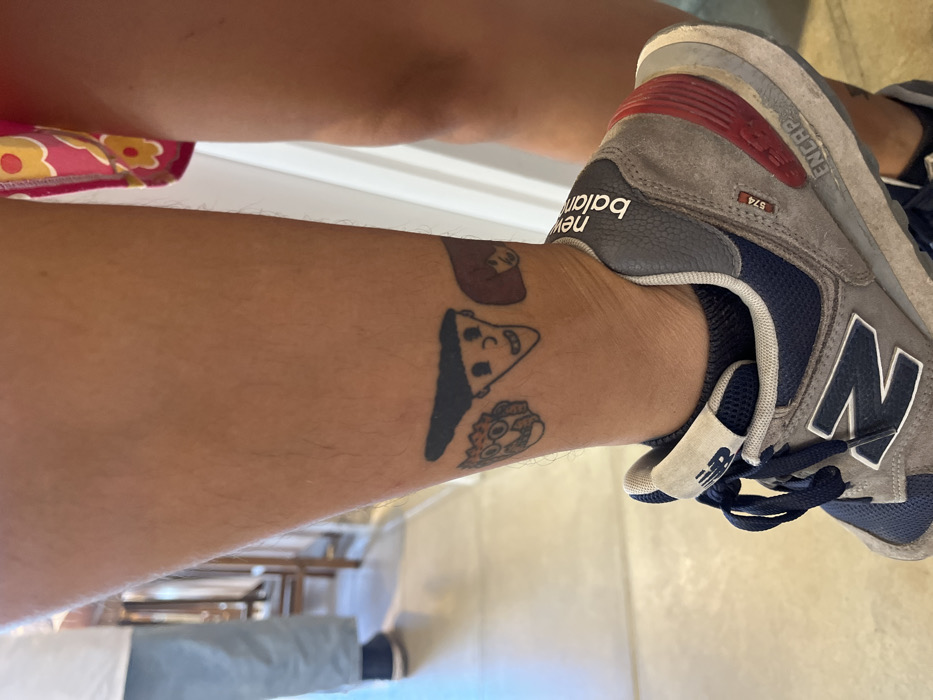 An angled view shows a person's lower leg with three cartoon tattoos: a slice of pizza with a face, a blob character, and a circular pizza