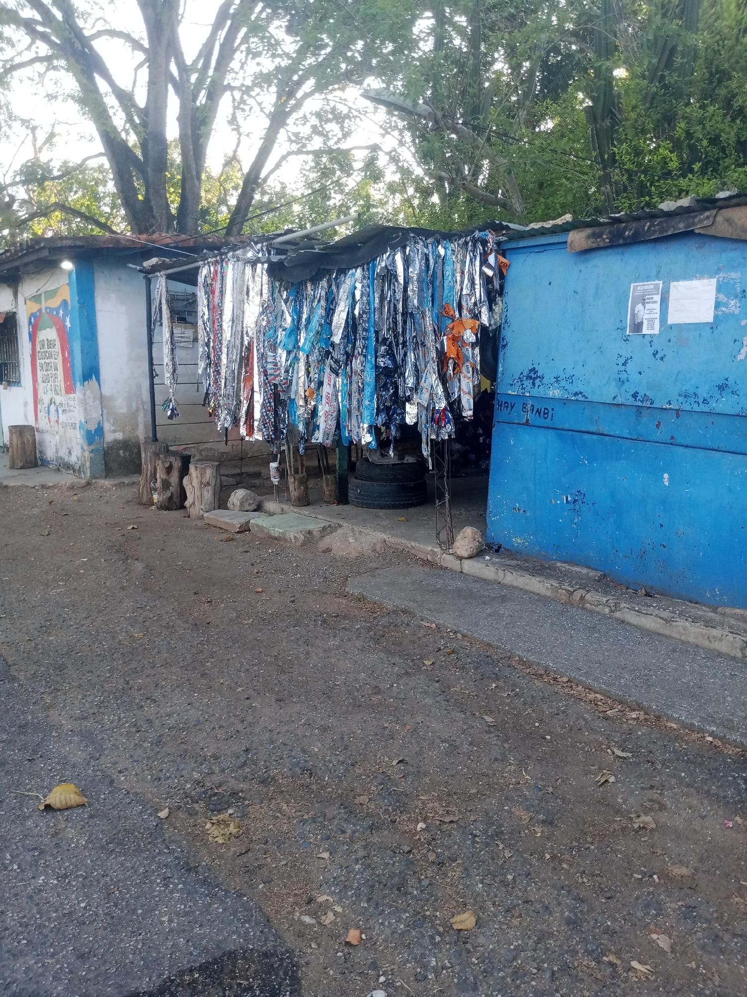 The image depicts a street scene in Caño de Indio, Venezuela. A small roadside stand is visible, consisting of a makeshift shelter constructed of corrugated metal and other materials. Numerous items, potentially for sale, are hanging from the front of the structure, including strips of shiny fabric and various other objects. Adjacent to the stand is a blue structure, possibly a small shop or storage unit, with some posters or advertisements affixed to its surface. Graffiti is visible on the blue structure. The road in front of the stand appears to be paved but in a state of disrepair. There are trees visible in the background. The lighting suggests it is daytime. No people are visible in the image.
