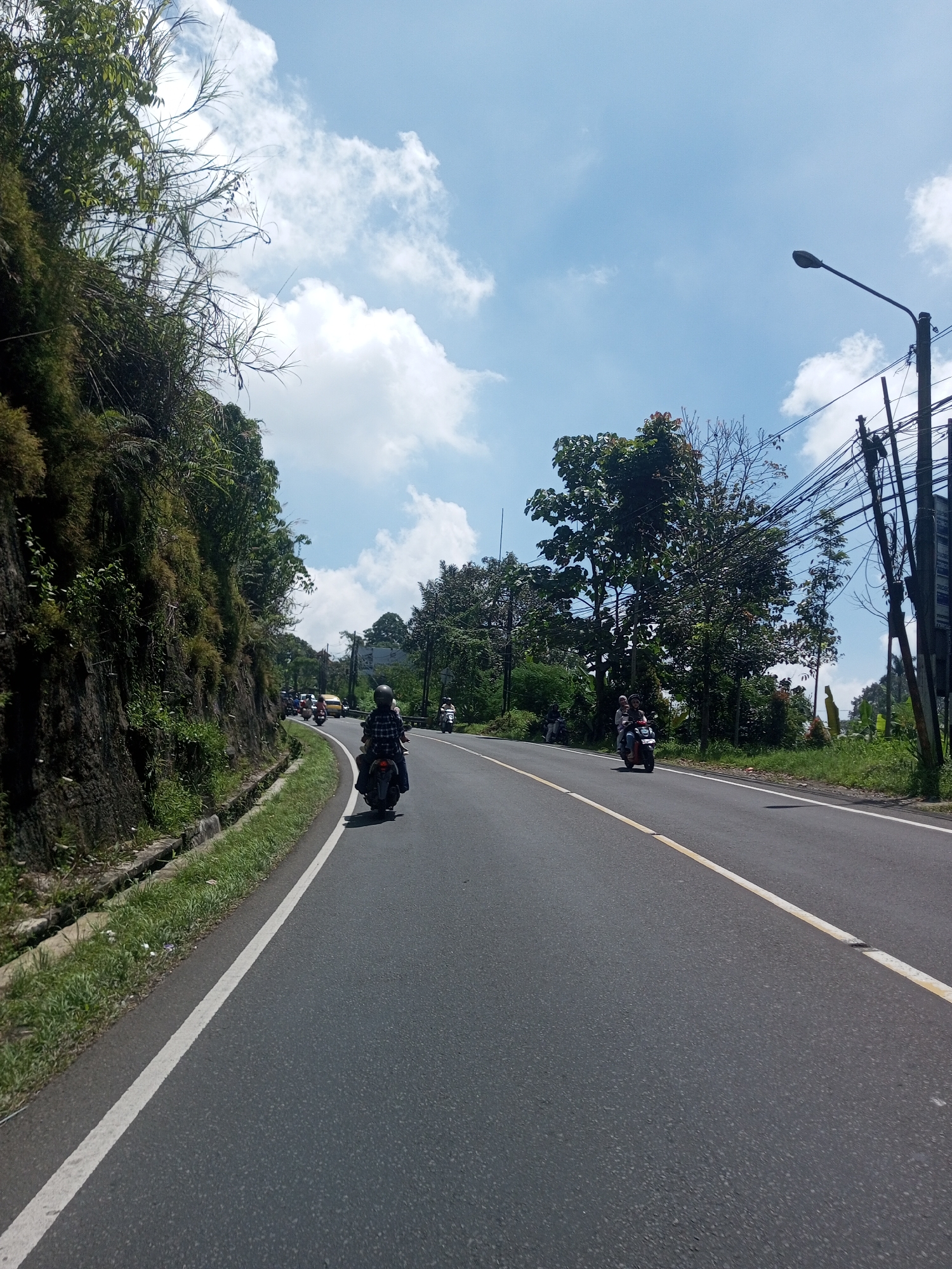 A road in a lush, green area. Three motorbikes are on the road, and a few others are in the distance. There are utility poles on the right side of the road. A grassy hill is on the left side. The sky is partly cloudy. The location is in the city of Phonethan, Laos.
