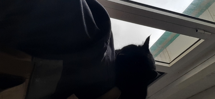 The image displays an interior scene in Qorovulbozor, Uzbekistan. A black cat is the central subject, viewed from behind, its head and pointed ears silhouetted against a bright window as it looks outward. The window features white polyvinyl chloride (PVC) frames, with a silver hinge visible on the left vertical frame. Beyond the window, a light grey, overcast sky is visible, and a subtle teal-colored outline is present through the upper right pane, possibly indicating a distant structure or reflection. No human figures are explicitly visible. Below and to the left of the cat, a dark, folded fabric, consistent with clothing, is present. To the right, a dark, angular object, possibly wooden, is partially visible.