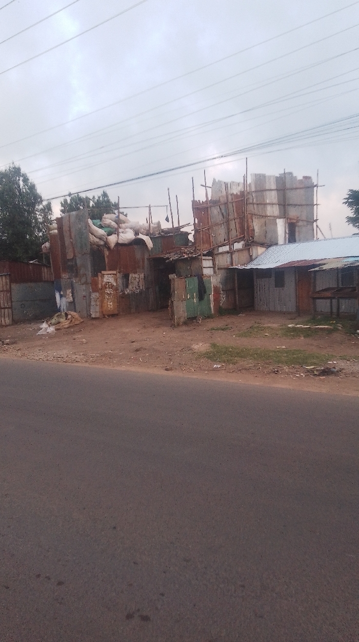 A roadside scene depicts a haphazard collection of shacks constructed from corrugated metal and wood. The buildings appear to be in disrepair, with some parts seemingly under construction. Sacks are piled on top of some of the structures. A paved road is visible in the foreground, with overcast skies above. Trees are seen in the background.