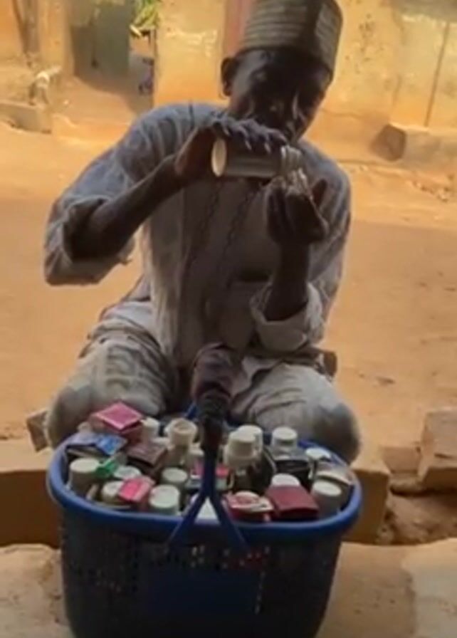 An older man wearing a white patterned shirt and a patterned kufi sits cross-legged outdoors behind a blue plastic basket brimming with various jars, bottles, and boxes