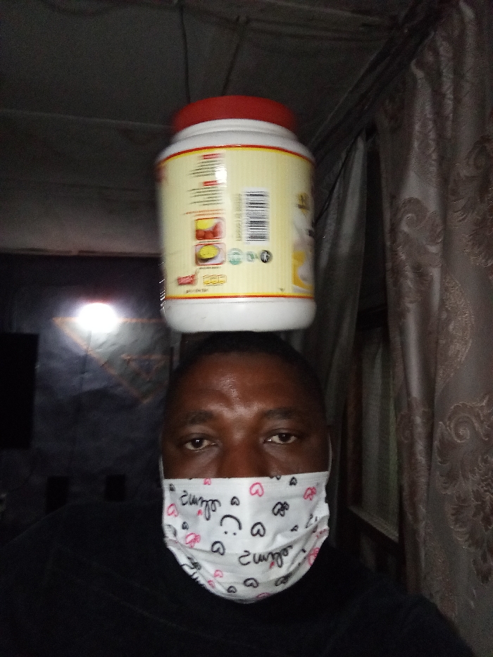 A man wearing a black shirt and a face mask with heart and smiley face patterns balances a white jar with a red lid on his head. The jar has a nutritional information label with barcodes visible. The background includes dark curtains, a ceiling fixture, and a partially visible television screen emitting light.